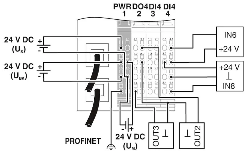 O acoplador de Bus para o protocolo PROFINET contém 4 saídas digitais e 8 entradas digitais. No pacote encontram-se todos os conectores Inline necessários para a conexão de alimentação e periféricos.